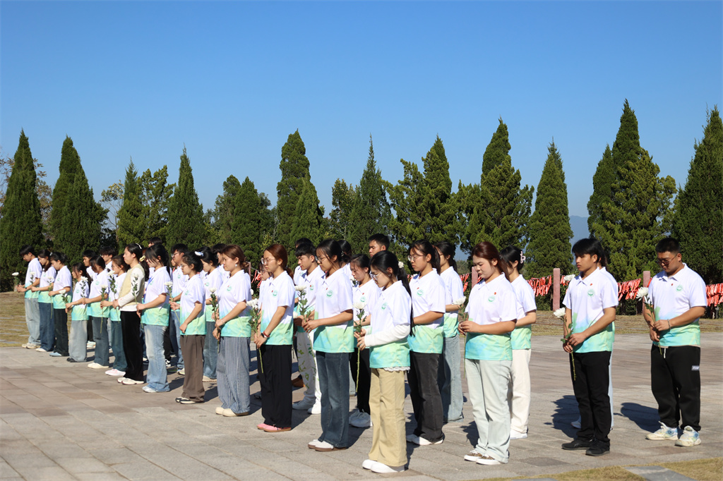 在觉山铺阻击战遗址,面对英烈长眠之地,学员们敬献鲜花、行三鞠躬礼。这里是湘江战役中规模最大,伤亡最惨重的阻击战。红军在此血战三天三夜,以血肉之躯筑起军委纵队渡江的通道。